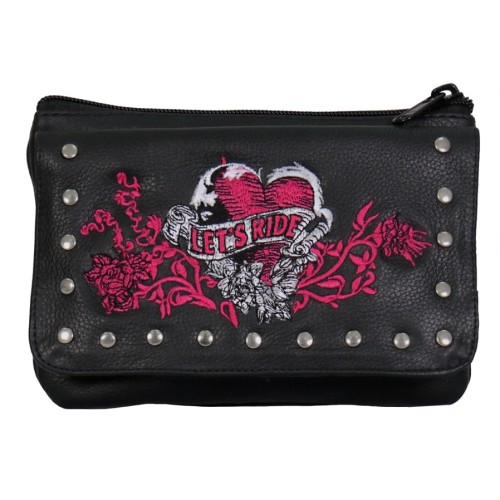 Misure circa 18 cm x 12 cm - Il ricamo a cuore con scritta Let's Ride mette in risalto questo borsello versatile in pelle. È dotato di una parte superiore con cerniera con portamonete e fessure per documenti. La parte anteriore ribaltabile ha una chiusura magnetica e una tasca interna foderata. La pesante chiusura ad artiglio è della misura giusta per i tuoi jeans. Viene fornito con una tracolla in pelle opzionale regolabile per la spalla o la tracolla.