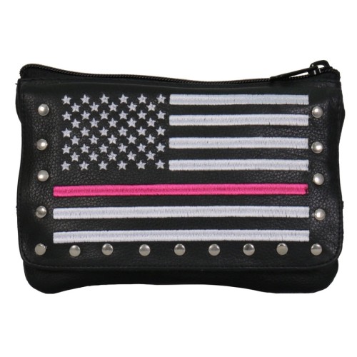 Misure circa 18 cm x 12 cm - Il ricamo della bandiera americana a righe rosa mette in risalto questo borsello con clip in pelle. È dotato di una parte superiore con cerniera con portamonete e fessure per documenti. La parte anteriore ribaltabile ha una chiusura magnetica e una tasca interna foderata. La pesante chiusura ad artiglio è della misura giusta per i tuoi jeans. Viene fornito con una tracolla in pelle opzionale regolabile per la spalla o la tracolla.