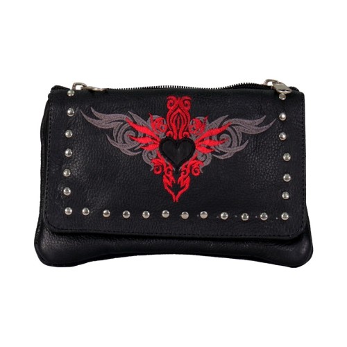 Misure circa 18 cm x 12 cm - Il ricamo a cuore mette in risalto questo borsello versatile in pelle. È dotato di una parte superiore con cerniera con portamonete e fessure per documenti. La parte anteriore ribaltabile ha una chiusura magnetica e una tasca interna foderata. La pesante chiusura ad artiglio è della misura giusta per i tuoi jeans. Viene fornito con una tracolla in pelle opzionale regolabile per la spalla o la tracolla.