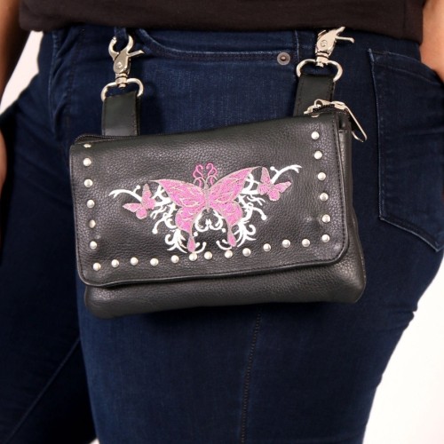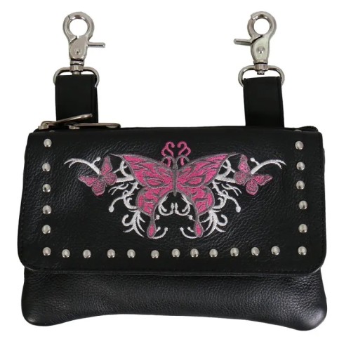Misure circa 18 cm x 12 cm - Il ricamo a farfalla rosa mette in risalto questo borsello versatile in pelle. È dotato di una parte superiore con cerniera con portamonete e fessure per documenti. La parte anteriore ribaltabile ha una chiusura magnetica e una tasca interna foderata. La pesante chiusura ad artiglio è della misura giusta per i tuoi jeans. Viene fornito con una tracolla in pelle opzionale regolabile per la spalla o la tracolla.