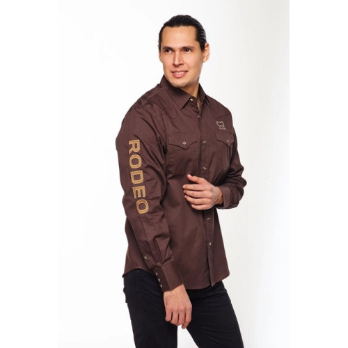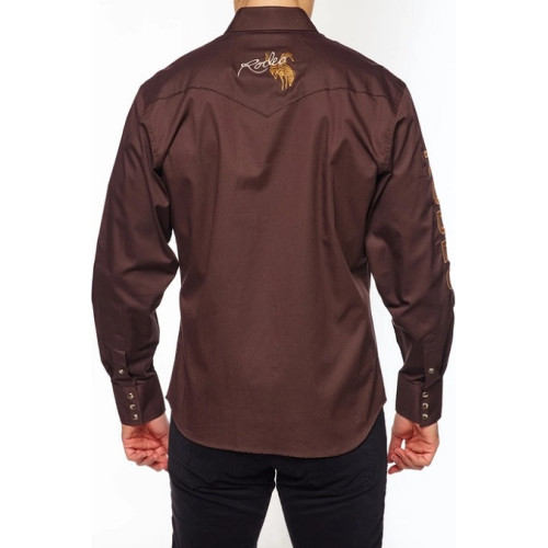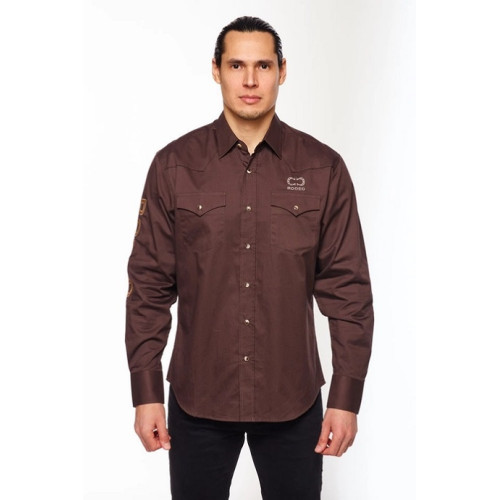 Camicia western Rodeo Clothing con logo western e scritta ricamati. Due tasche sul petto con patta a pressione in stile western. Bottoni a pressione.