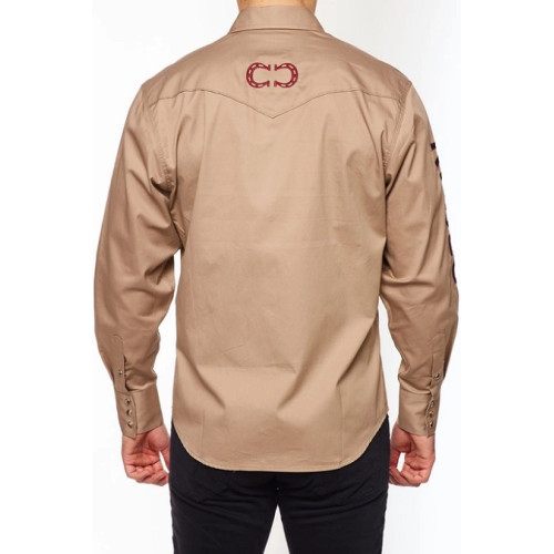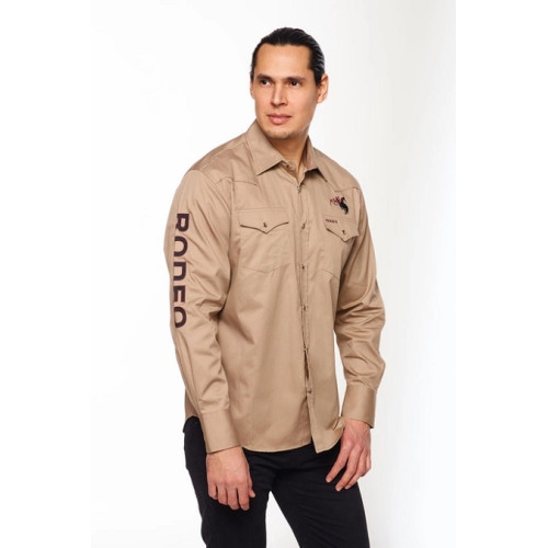 Camicia western Rodeo Clothing con logo western e scritta ricamati. Due tasche sul petto con patta a pressione in stile western. Bottoni a pressione.