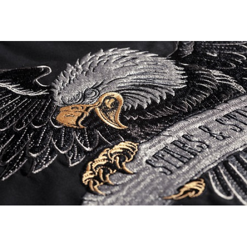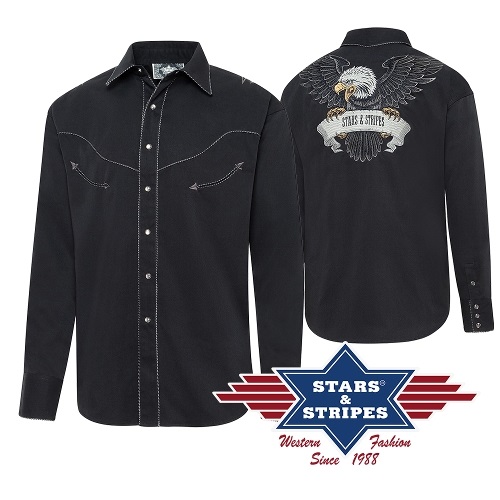 Splendida camicia western nera con una grande aquila finemente ricamata sul retro. Coordinato con profili in corda bicolore, bottoni a pressione e polsini a 4 bottoni.