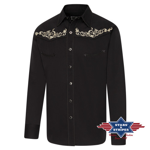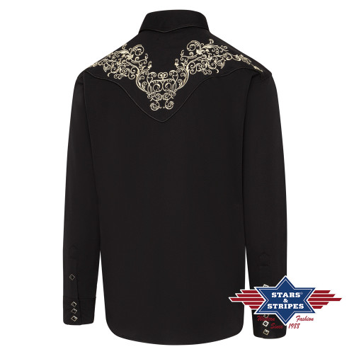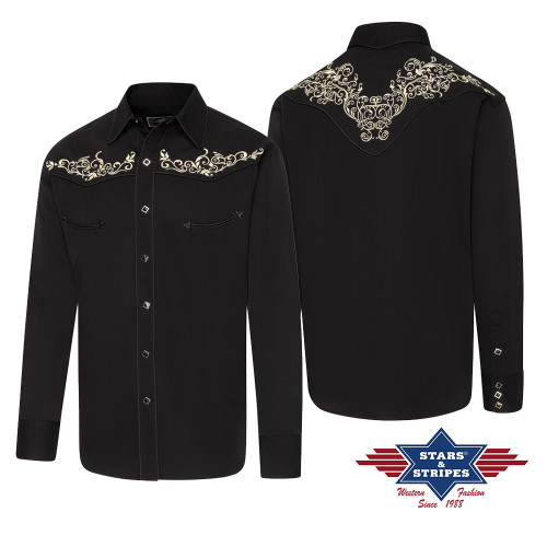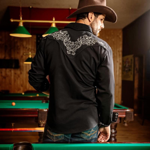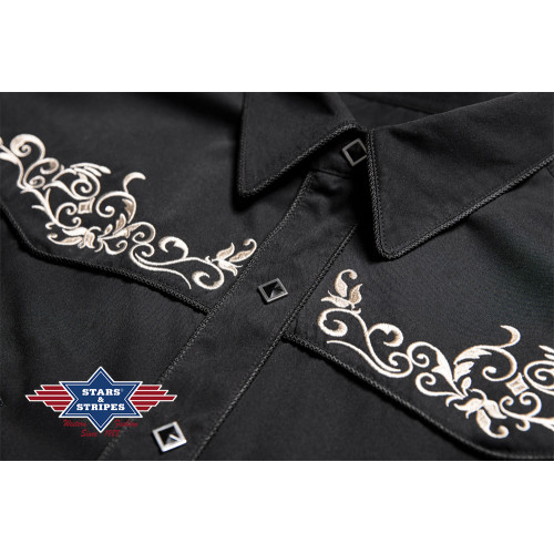 Camicia western nera con splendidi ricami floreali sul petto e sulla schiena. Bottoni a pressione.