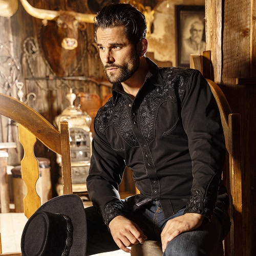 Splendida camicia western nera con splendidi ricami sul petto e sulla schiena tono su tono. Armoniosamente coordinato con piping in corda e polsini a sei bottoni. Bottoni a pressione.