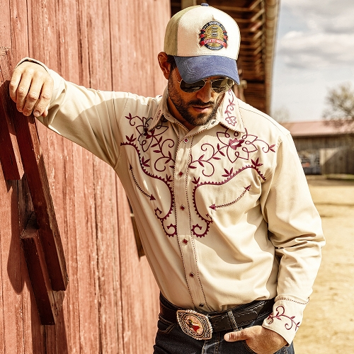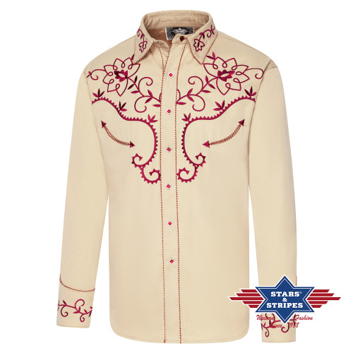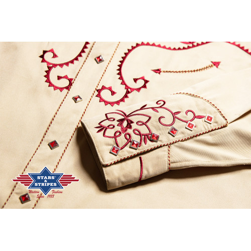 Camicia western beige con splendidi ricami sul petto, sulla schiena, sui polsini e sul colletto. Carré western ricamato. I polsini, l'abbottonatura e il colletto in stile western sono impreziositi da bordini in corda bicolore. Le tasche con smile e i polsini a sei bottoni riflettono la classica moda occidentale. Bottoni a pressione.
