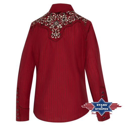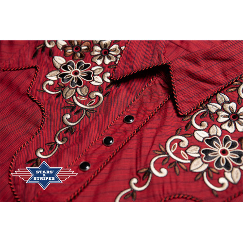 Splendida camicia western rossa con ricami floreali western fronte e retro. Bottoni a pressione.