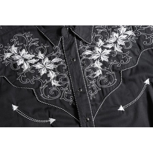 Camicia western con splendidi ricami sul petto e sulla schiena. Coordinato con profili in corda bicolore e polsini a triplo bottone. Bottoni automatici.