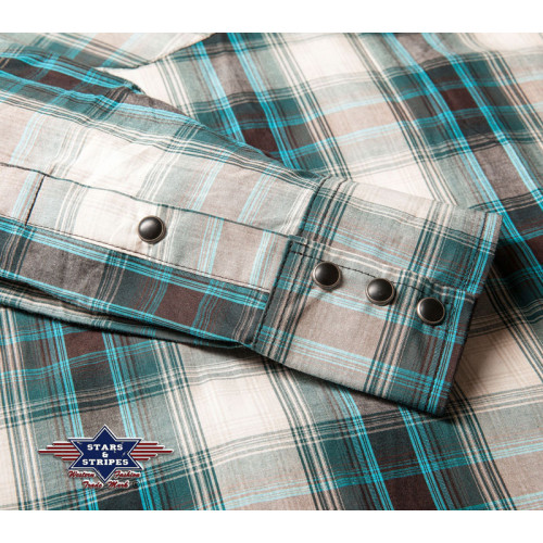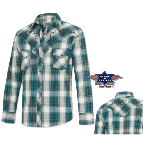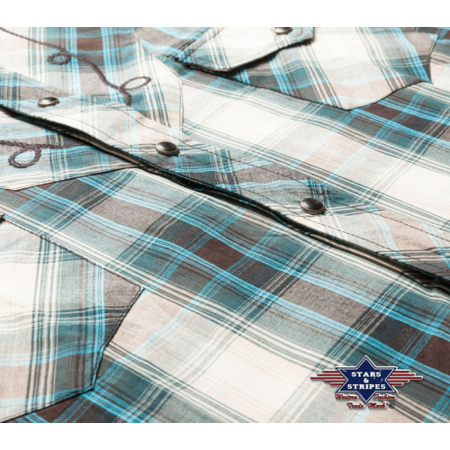 Camicia western a quadretti con ricamo, tasche sul petto e laccetto in tessuto per tenere arrotolate le maniche. Con bottoni a pressione.