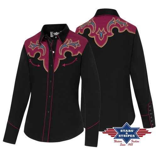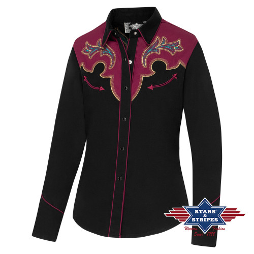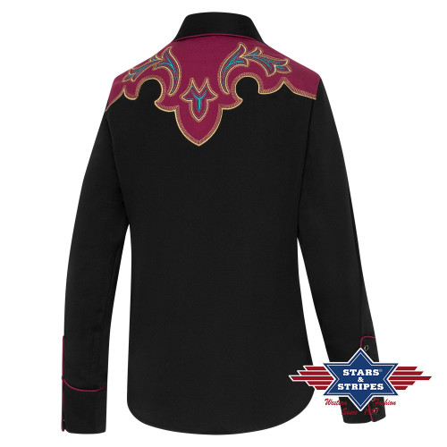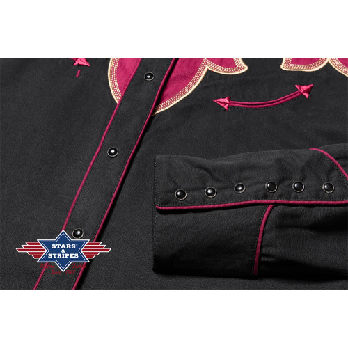 Camicia western nera con splendidi ricami western sul fronte e sulla schiena. I polsini con sei bottoni riflettono la classica moda western. Bottoni a pressione.