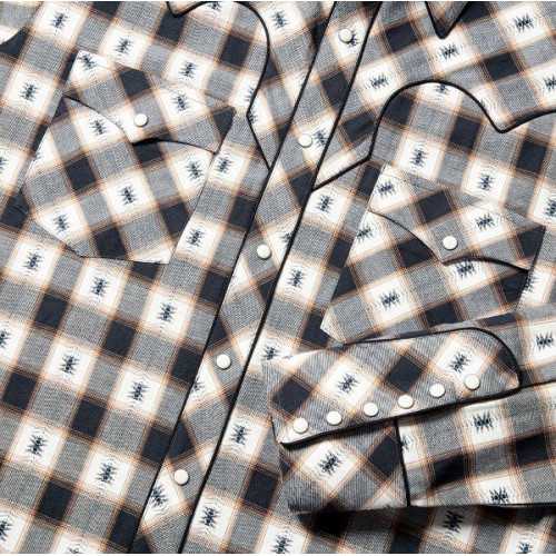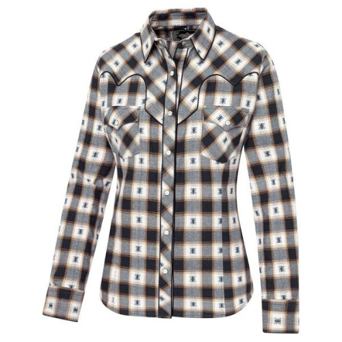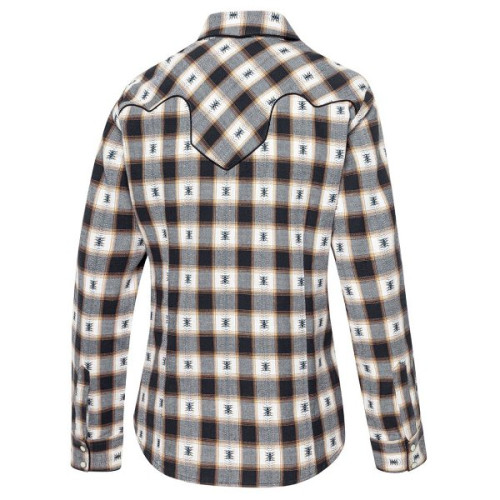 Camicia tipicamente western style con motivo a quadri in colori tenui con piccoli dettagli intrecciati. Bottoni a pressione.