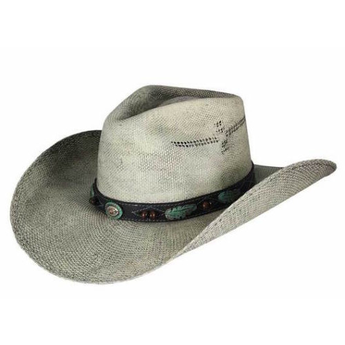 Il cappello in paglia bangora di alta qualità "Rampage" di Bullhide presenta un colore grigio particolare, con cinturino decorato in sfumature del turchese.