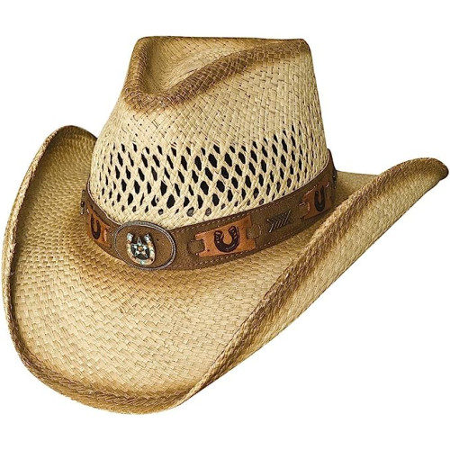 Il "Lucky Strike" è un cappello di paglia Panama con una fascia in pelle marrone con sovrapposizioni decorate con ferri di cavallo.