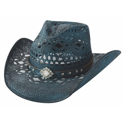 Questo cappello da cowgirl in paglia toyo è leggero e airbrushed, presenta un cinturino con borchie rotonde e un concho centrale a forma di diamante impreziosito da strass.