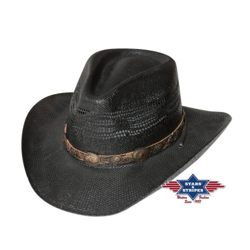 Cappello western Stars & Stripes Fresno, realizzato in paglia di alta qualità con cinturino in pelle e conchos.
