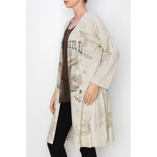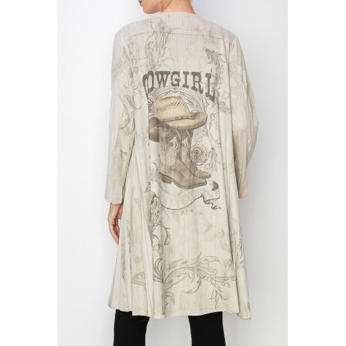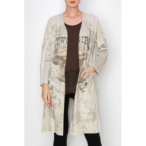 Prova la fusione di stile e comfort con il nostro spolverino cardigan effetto pelle scamosciata sintetica con scritta Cowgirl di Origami Apparel. .