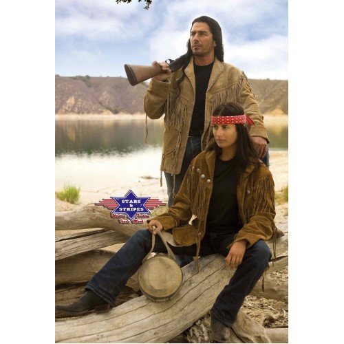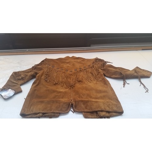 Giacca western in pelle effetto scamosciato con lacci e frange sul davanti e sul retro. Orlo sagomato con intaglio distintivo. Una tasca interna.