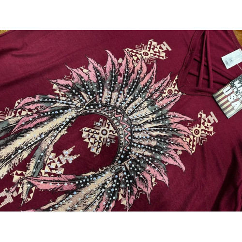Questa T-Shirt Top Liberty Wear presenta un copricapo dei nativi americani accentato da strass con una doppia scollatura incrociata. Realizzato con cura negli Stati Uniti.
