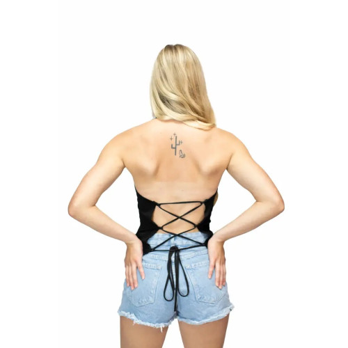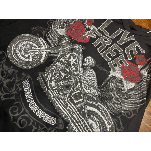 Canotta Top Liberty Wear con parte posteriore annodata che presenta uno scheletro in sella a una moto, rose rosse e la scritta «Live Free» impreziosita da strass.