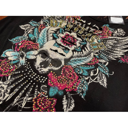 Questa Canotta Top Liberty Wear presenta la bellissima grafica Devilish Design accentuata da strass e tagli nella parte anteriore e una parte posteriore in pizzo. Realizzato con cura negli Stati Uniti.