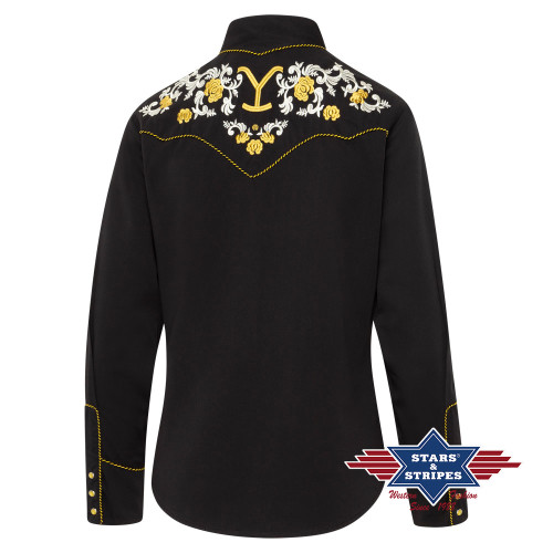 Camicia western Yellowstone raffinata con ricami bicolore sul petto e sul retro. Il carré western è messo in risalto da un profilo a cordoncino bicolore. I falsi smiley e i polsini con tripla abbottonatura richiamano la classica moda western. La camicia unisce un tessuto di facile manutenzione a un taglio sartoriale che valorizza la figura. Prodotto ufficiale serie Yellowstone Dutton Ranch. Si abbina perfettamente alla camicia DORIAN.