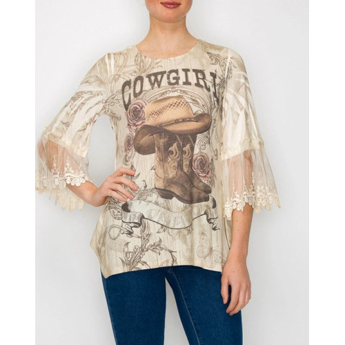 Top Origami Apparel stampa Cowgirl con maniche rifinite in pizzo