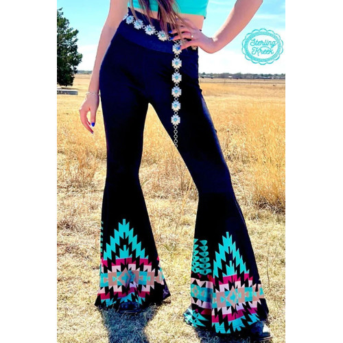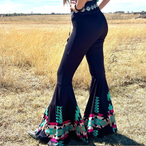 Questi pantaloni a campana neri a tinta unita aggiungono il perfetto tocco di grinta al tuo outfit, completi di un fondo stampato di ispirazione azteca che non passerà inosservato.