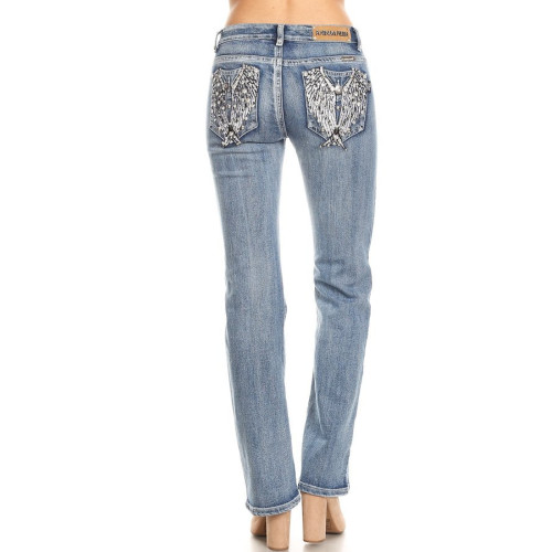 Jeans bootcut light-wash con dettagli di ali ricamate impreziosite da strass sulle tasche posteriori, design a 5 tasche. L'IMMAGINE PUO' DIFFERIRE PARZIALMENTE DAL PRODOTTO PER GRANDEZZA RICAMI E POSIZIONAMENTO DEI BRILLANTINI