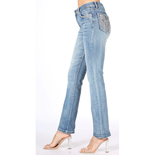 Jeans bootcut light-wash con dettagli di pistole ricamate impreziosite da strass sulle tasche posteriori, design a 5 tasche.