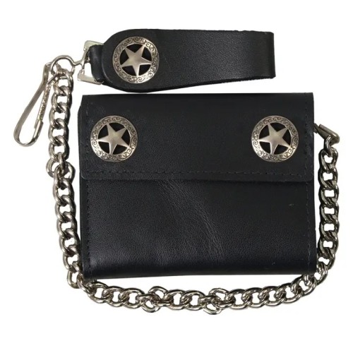 Portafoglio in pelle caratterizzato da medaglioni in metallo a forma di stella western, una catena metallica robusta e un passante per cintura in pelle con bottone a scatto.