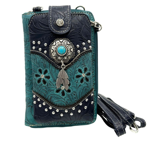 Southwest style design floreale con concho con piume. La tasca frontale protetta da una linguetta magnetica, è perfetta per trasportare il tuo smartphone. Le dimensioni dovrebbero adattarsi agli smartphone più diffusi, a seconda della custodia del telefono. Dimensioni totali circa 20x12 cm