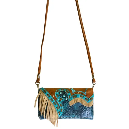 Portafoglio Floral Frange Turquoise in Ecopelle - con Tracolla