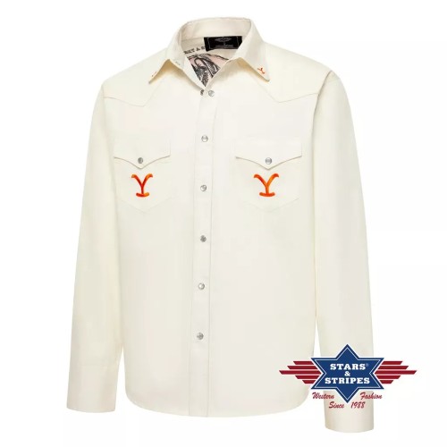 Raffinata camicia Western Yellowstone con ricamo premium sul retro. Il carré western è valorizzato da profili a contrasto. Le tasche sul petto applicate con bottoni a pressione richiamano il classico stile da cowboy workwear. Il marchio Yellowstone "Y" è ricamato sulle tasche del petto, sulle punte del colletto e sul retro del collo. La camicia unisce un tessuto di facile manutenzione a una vestibilità sartoriale, rendendola accattivante non solo per i fan del Dutton Ranch.