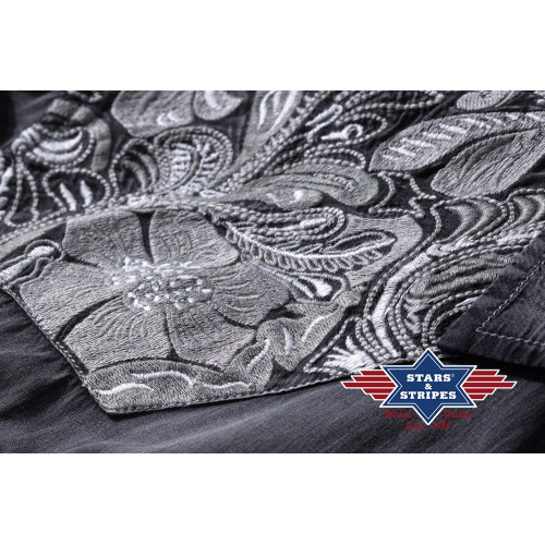 Fantastica camicia western sbiadita con carré western ricamato con decorazione floreale.Le tasche sul petto, le vivaci cuciture decorative e i bottoni automatici neri rendono la camicia un must.