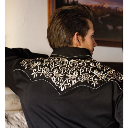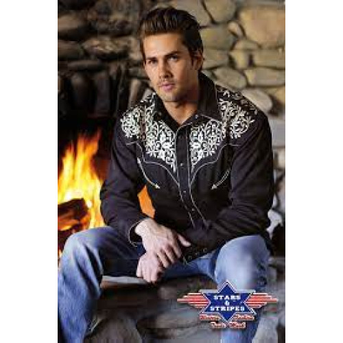Splendida camicia western con splendidi ricami sul petto e sulla schiena. Armoniosamente coordinato con profili in corda bicolore e polsini a triplo bottone. Bottoni a pressione.