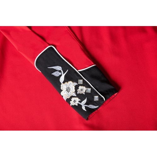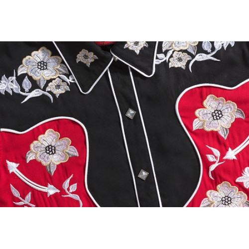 Blusa western rossa con eccezionale spallina western nera e magnifici ricami sul petto e sul retro, oltre che sui polsini neri. Bottoni a pressione.