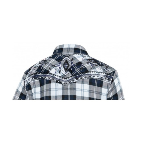 Blusa a quadri con ricami sul davanti e sul retro, tasche applicate sul petto, bottoni a pressione e rifinitura in satin sul collo, nella fila dei bottoni e sulle patte delle tasche e dei polsini.
