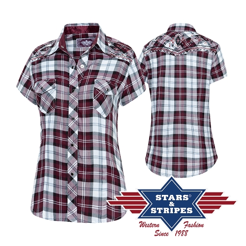 Blusa a quadri a maniche corte con ricami davanti e dietro, tasche applicate sul petto, bottoni a pressione e rifinitura in satin sul collo, nella fila dei bottoni e sulle patte delle tasche.