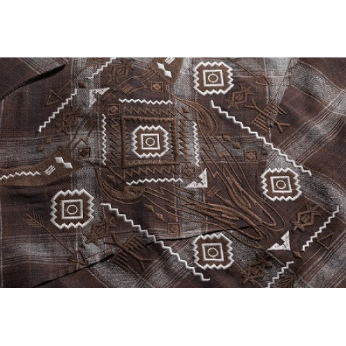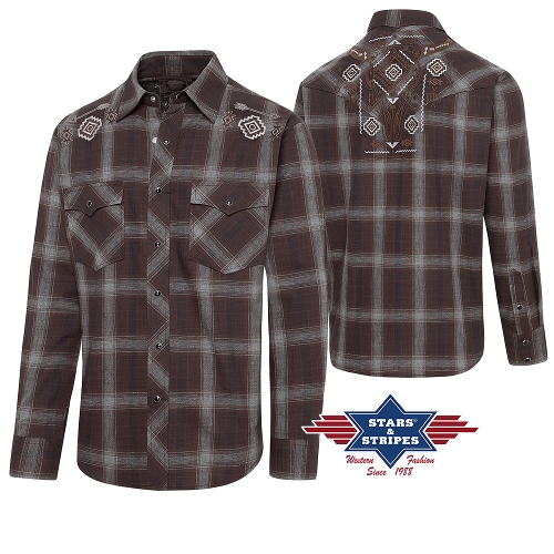Camicia western a quadretti con ricami in stile azteco sul davanti e sul retro. Le tasche a toppa sul petto, il delicato carré western sul retro e gli eleganti bottoni a pressione rendono la camicia un vero gioiello.