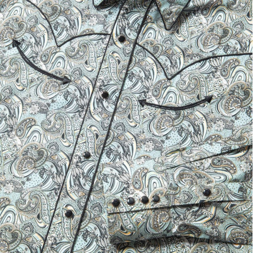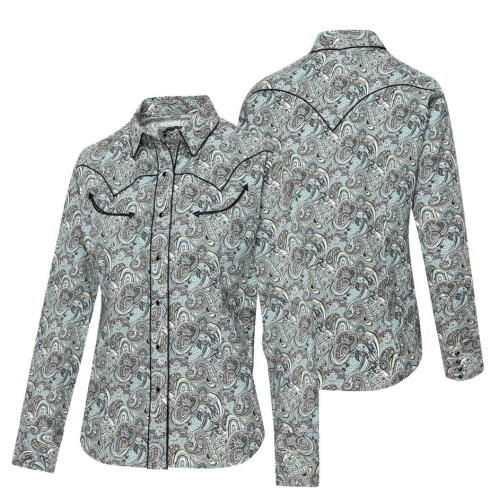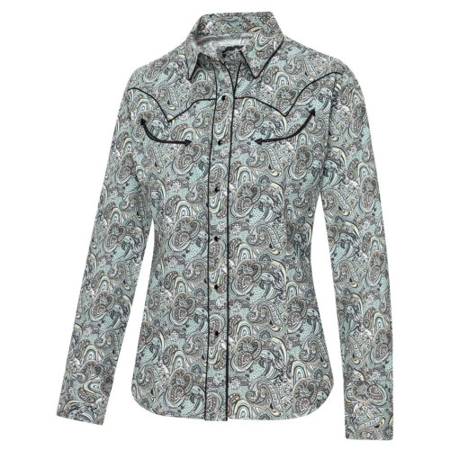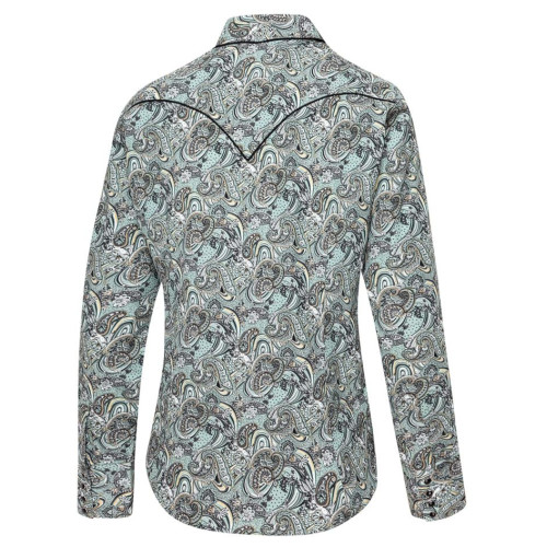Questa affascinante camicetta western presenta un motivo dettagliato in una sottile combinazione di grigio e blu. Le finte tasche con smile, i polsini con 4 bottoni a pressione e i bordini scuri conferiscono alla camicia un classico look da cowgirl. Bottoni a pressione.