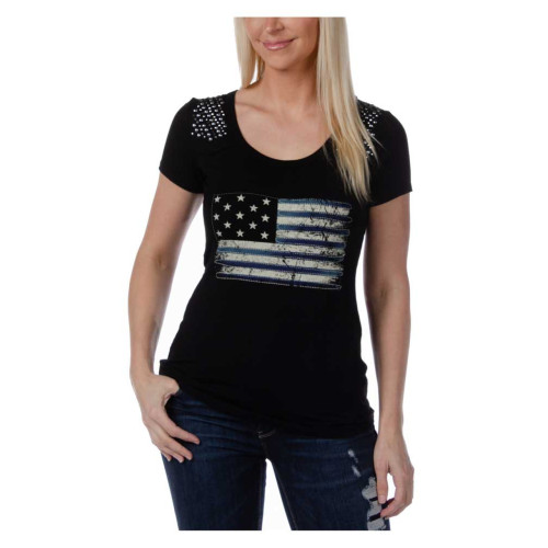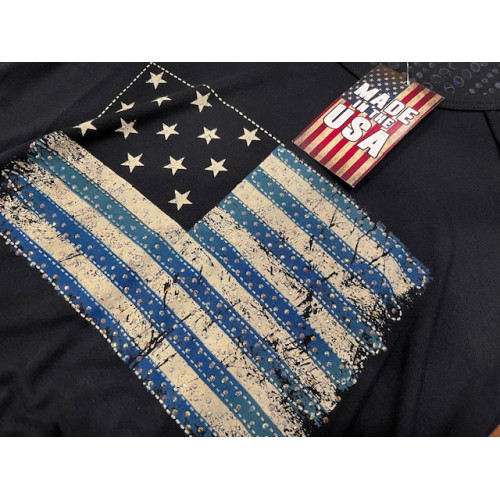 Top Liberty Wear con una bandiera americana impreziosita da strass e spalle borchiate. Realizzato con cura negli Stati Uniti. Celebra il tuo amore per l'America con stile e comfort. Acquista ora e indossa l'autenticità americana.
