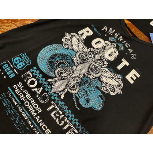 Top Liberty Wear con strass stile Route 66, con scritta "American Road Tested". Realizzato con cura negli Stati Uniti.