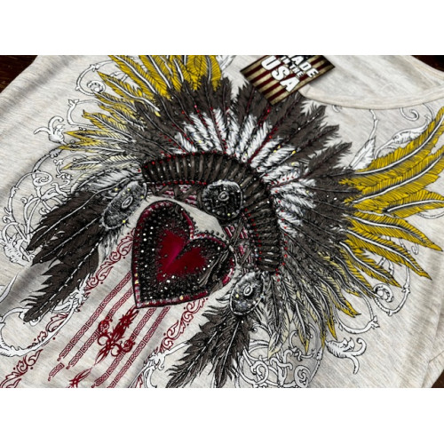 Questa T-Shirt Top Liberty Wear con design Native American Heart color avena presenta un design con piume, cuore e copricapo nativo americano impreziosito da strass, con lo stesso design sul retro senza strass. Realizzato con cura negli Stati Uniti.