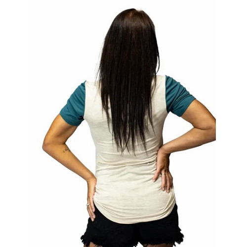 Questa T-Shirt Liberty Wear con scollo a V e maniche a contrasto presenta un vivace paio di stivali western con speroni impreziositi da strass.