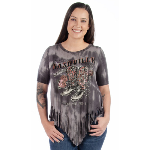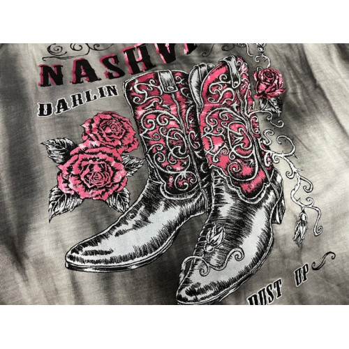 Questo top Liberty Wear è caratterizzato da un lavaggio mineral wash, frange e stivali accentuati da un colore rosa. Realizzato con cura negli Stati Uniti con il 95% di rayon e il 5% di spandex.