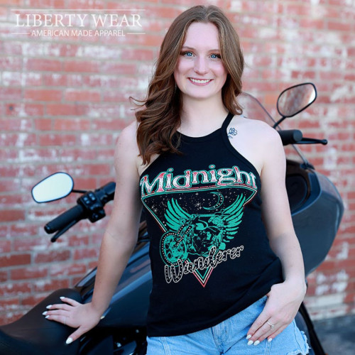 Canottiera con grafica «Midnight Wanderer» con una moto impreziosita da strass. Realizzato con cura negli Stati Uniti.
