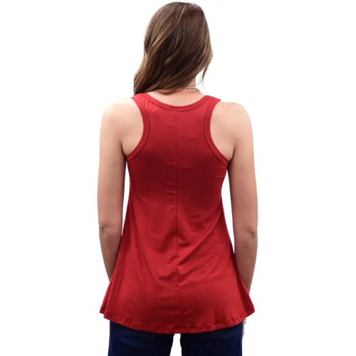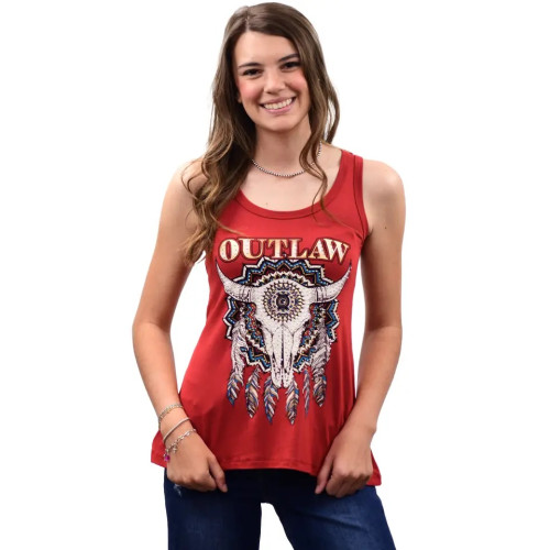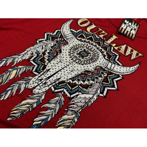 Canotta di colore rosso arrugginito con grafica colorata «Outlaw» con testa di toro e piume impreziosita da strass.