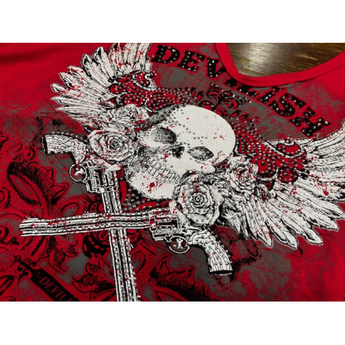Questa Canotta Top Liberty Wear presenta il logo Devilish con teschio, rose, ali e pistole incrociate impreziosite da strass sul davanti con una parte posteriore con tagli laser. Realizzato con cura negli Stati Uniti.