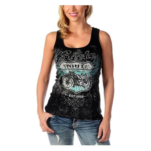 Questa canotta Liberty Wear Rider Route 66 presenta una moto impreziosita da strass con due bandiere da gara e scritta 66 sul retro. Realizzato con cura negli Stati Uniti.