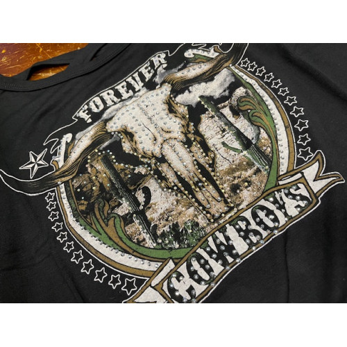 Questa T-Shirt Top Liberty Wear presenta una scritta Forever con disegno di teschio di toro e cactus impreziosito da strass. Realizzato con cura negli Stati Uniti.